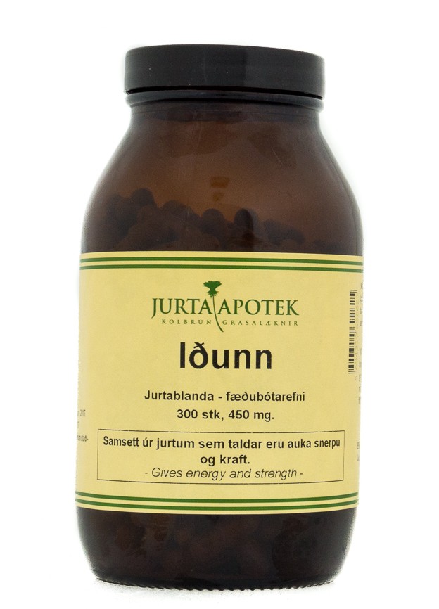 Iðunn gefur líkamanum aukinn kraft og orku, heinsar blóðið og vinnur gegn stressi. Er næringarrík og auðug af B12 vítamíni, járni og blaðgrænu. Iðunn er góð fyrir skólafólk og þá sem vinna kyrrsetuvinnu og þurfa á aukinni orku að halda. Má taka að staðaldri.